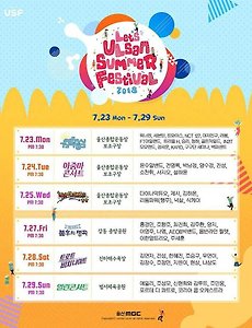 [18.07.23 - 18.07 29] 울산 썸머 페스티벌 [18.07.23] 음악중심 - 워너원,세븐틴,트와이스,NCT127,여자친구,라붐,FT아일랜드,트리플H,경기,청하,골든차일드,IN2IT,모모랜드,정세운,KARD,구구단 세미나,백퍼센트[18.07.24] 아줌마콘서트 - 윤수일밴드,전영록,박남정,양수경,진성,소찬휘,서지오,설하윤[18.07.25] SUPER SWAG 울산 - 다이나믹듀오,제시,김하온,리듬파워(행주),넉살,식케이[18.07.27] 불후의 명곡 - 홍경민,조항조,최진희,양지,이영주,나엠,AEOB빅밴드,윱반라인 퀼텟,이한얼트리오,주세훈[18.07.28] 트로트 비치나이트 - 김연자,진성,한혜진,조승구,우연이,김창수,조정민,지원이,현상,나상도[18.07.29] 열린콘서트 - 에일리,조성모,..